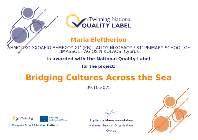 Το Στ’ Δημοτικό Σχολείο Αγίου Νικολάου Λεμεσού (ΚΒ) κατά τη σχολική χρονιά 2024 – 2025 συμμετείχε με ενθουσιασμό στο ευρωπαϊκό πρόγραμμα eTwinning, υλοποιώντας ένα συναρπαστικό project με τίτλο "Bridging Cultures across the Sea".